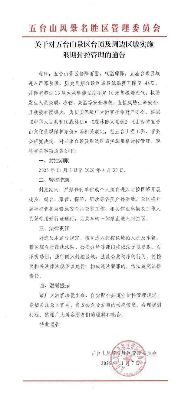 11月7日,山西忻州五台山景区发布通告称炒股如何配资,对景区台顶及周边区域实施限期封控管理。自2025年11月8日至2026年4月30日,严禁任何单位或个人擅自进入封控区域开展徒步、朝台、露营、探险、野炊等各类户外活动。