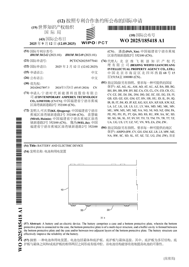 证券之星消息,根据企查查数据显示宁德时代(300750)公布了一项国际专利申请,专利名为“电池和用电装置”,专利申请号为PCT/CN2025/077041,国际公布日为2025年9月11日。
