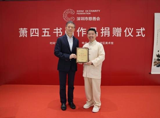 深圳市慈善会会长、市政协原主席戴北方为萧四五颁发“艺术慈善大使”荣誉证书。萧四五深耕书画领域数十年,是中国国家画院詹庚西艺术工作室访问学者、中国通俗文艺研究会副会长,迄今为止已在12个国家和地区举办个展和联展,其作品风格质朴自然、饱含人文情怀。据悉,他此次捐赠的画作包括“境象——萧四五人文书画作品巡回展(深圳站)”的主画《春天里的故事》和另外10幅人文作品。
