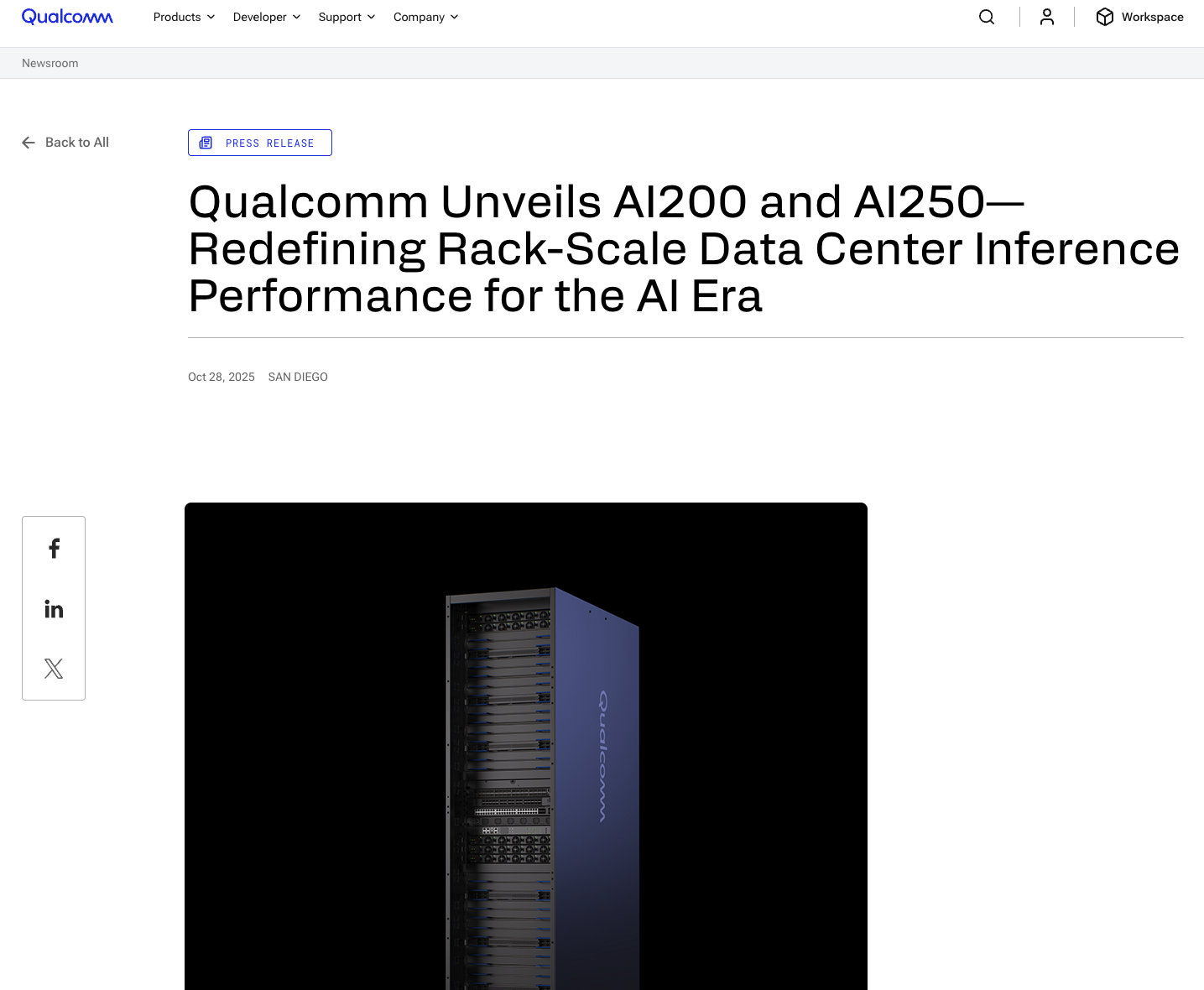 高通在公告中宣布,推出高通AI200和AI250芯片和机架产品,这些产品均采用公司的神经处理单元(NPU)技术。