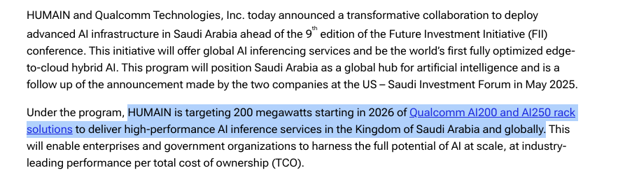 值得一提的是,高通今年5月曾与沙特国家级人工智能企业Humain签署合作协议。高通也在周一宣布,Humain是这款新芯片的首个用户,目标是从2026年起部署200兆瓦的AI200和AI250机架解决方案。